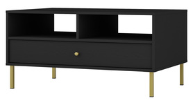 Stolik kawowy Oktio z szufladą i półkami 100 cm czarny grafit na złotych nogach
