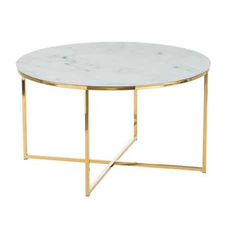 La collection des meubles Alisma, composée en tables basses effectives, s'intègre aux intérieurs pleins de splendeur. Le produit présenté constitue une table ronde avec la base géométrique. Le plateau en verre d'épaisseur 6 mm et les pieds ainsi que le support sont fabriqués en métal. Ils garantissent la stabilité - la charge maximale est 120 kg. Le motif de marbre et la couleur dorée décoreront votre salon, en lui donnant du chic.
